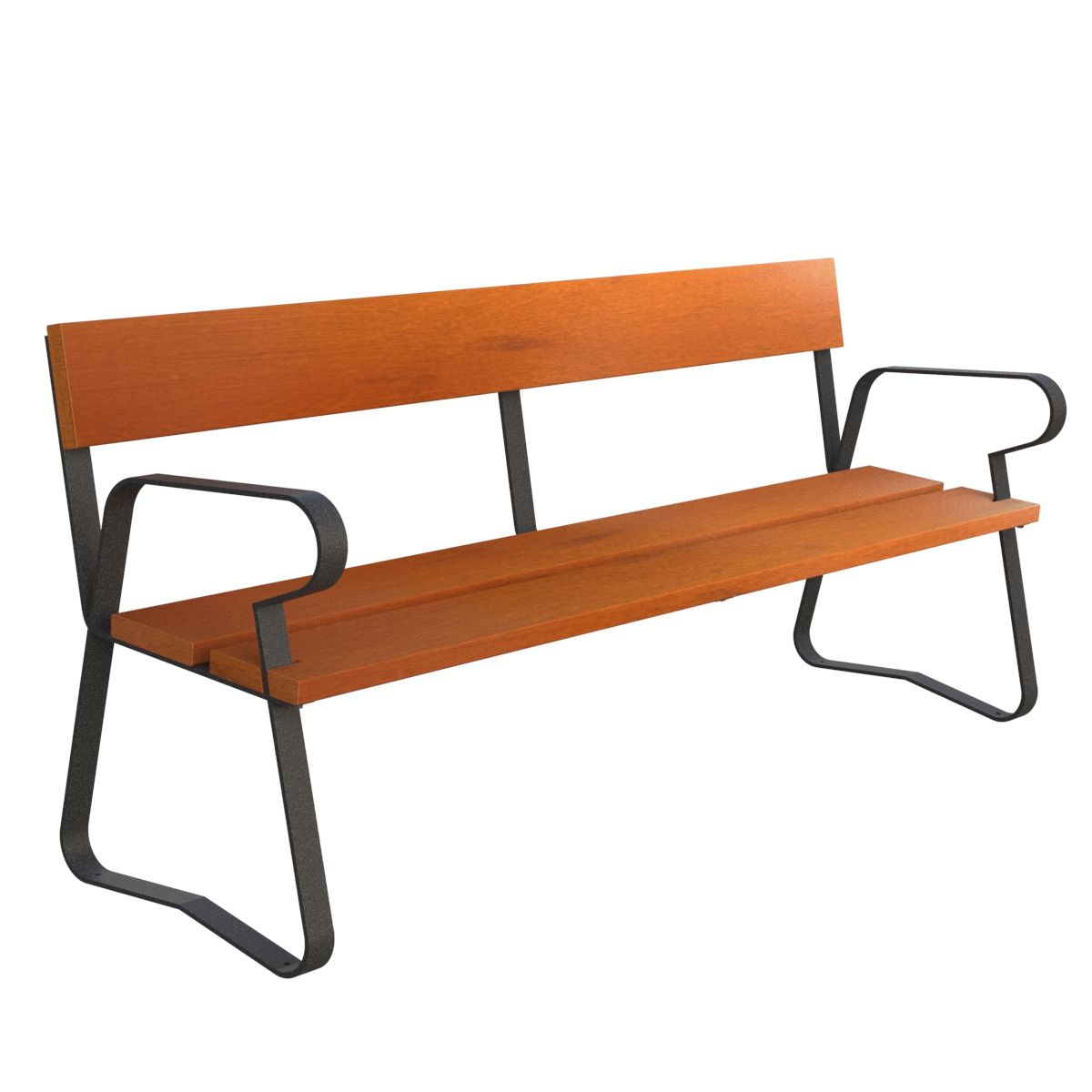 Banco tipo Madrid de 3 tablones de madera de guinea para colocación en exteriores de zonas urbanas como parque y jardines con soportes de pletina metálica de 50×8mm. pintados negro.