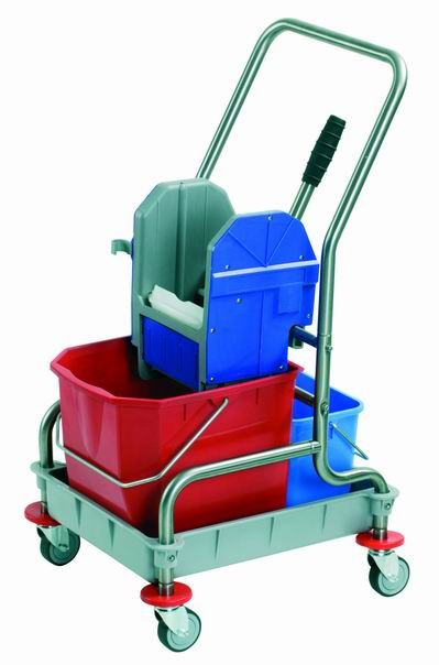 Carro limpieza fabricado de tubo acero inoxidable, con bandeja de polipropileno reforzada, con cubo de 25lts con prensa y uno de 6 lts.