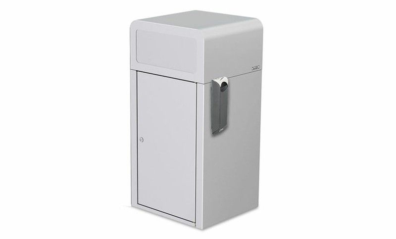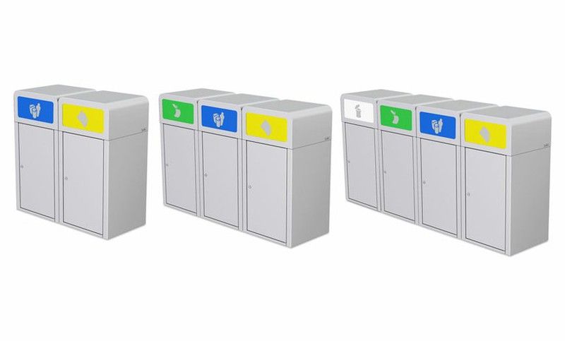 Papelera selectiva de gran capacidad con apertura frontal disponible con dos trampillas autocierre, una frontal y otra trasera., sistema de recogida: cubeto metálico con goma sujetabolsas.